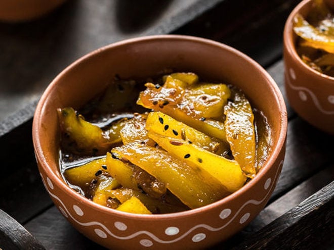 Raw Mango Launji -This unparalleled combination of sweet and sour Rajasthani chutney/pickle is prepared by cooking marinated raw mangoes in aromatic spices and sugar, to create the perfect sidekick for all your parathas! It can also be savoured with any Indian sabzi, giving the entire meal an extra edge.